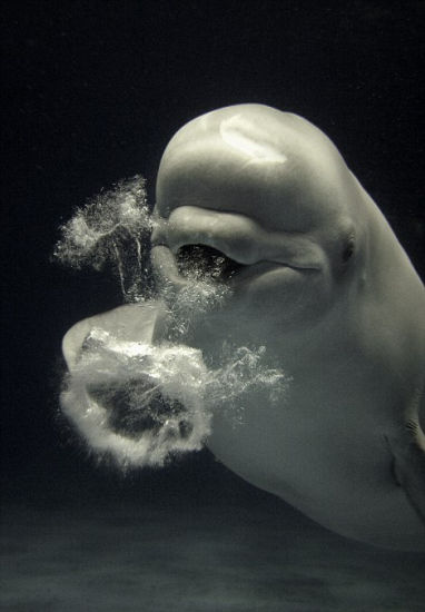 生活在日本島根縣水族館的白鯨共有3頭,圖中白鯨是其中之一。憑借在水中吐泡泡這種引人注目的表演,3頭白鯨成為游人推崇的對象。島根縣水族館共生活著1萬只動物,白鯨是其中最吸引游人目光的動物之一。這位日本攝影師Hiroya Minakuchi是在島根縣水族館拍到這頭白鯨吐泡泡畫面的。自從白鯨無師自通地學會了吹出一個像天使光圈狀的泡泡之后,她就成了島根水族館里的“紅人”。這頭可愛的小白鯨約10歲,三年多前學會了吹氣泡這門技巧,從此,憑借這獨門絕技迷倒了一大批來此參觀的游客。